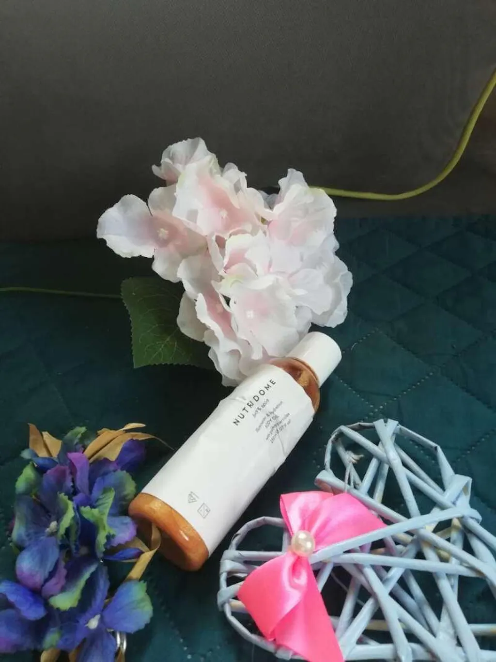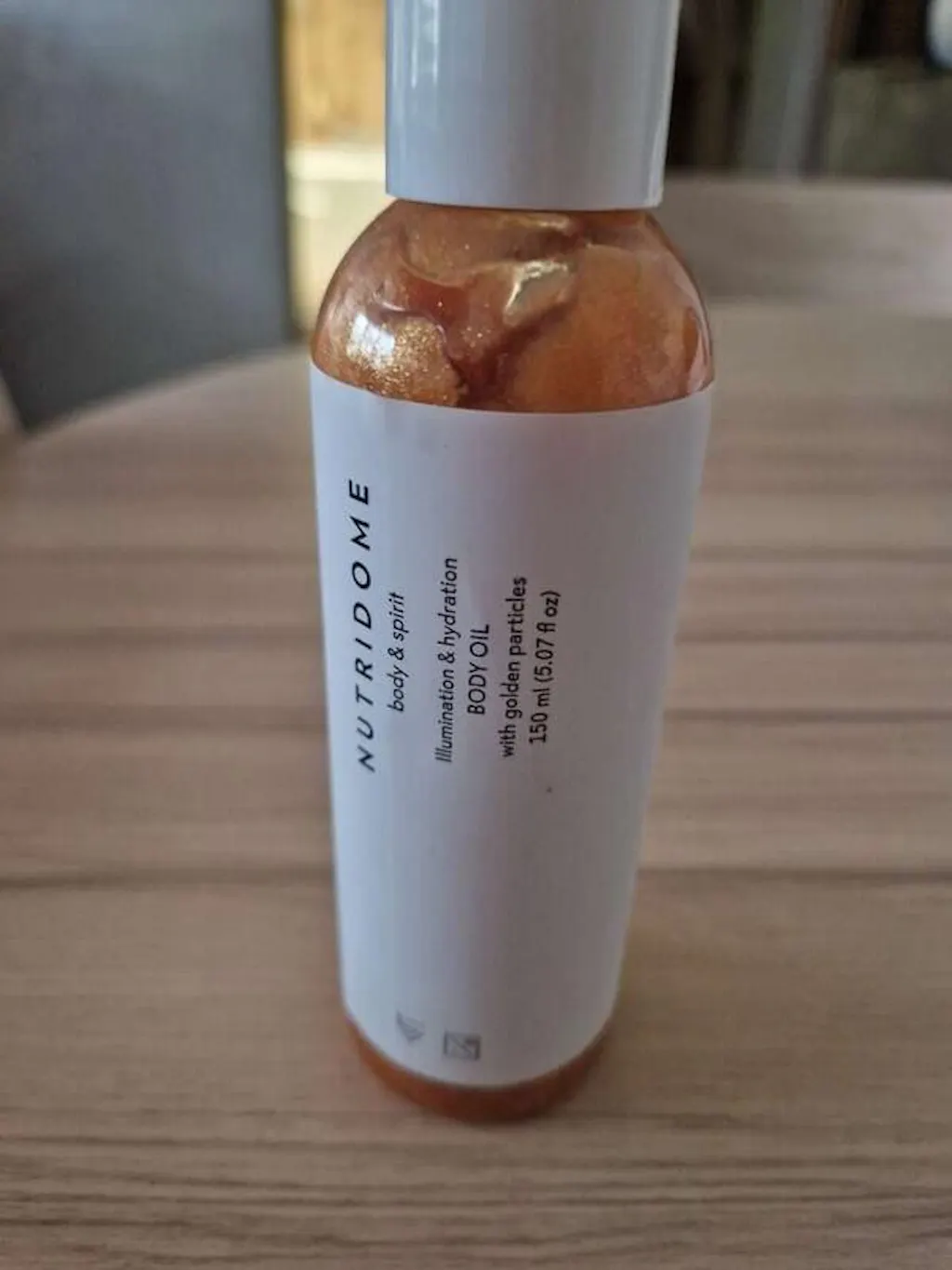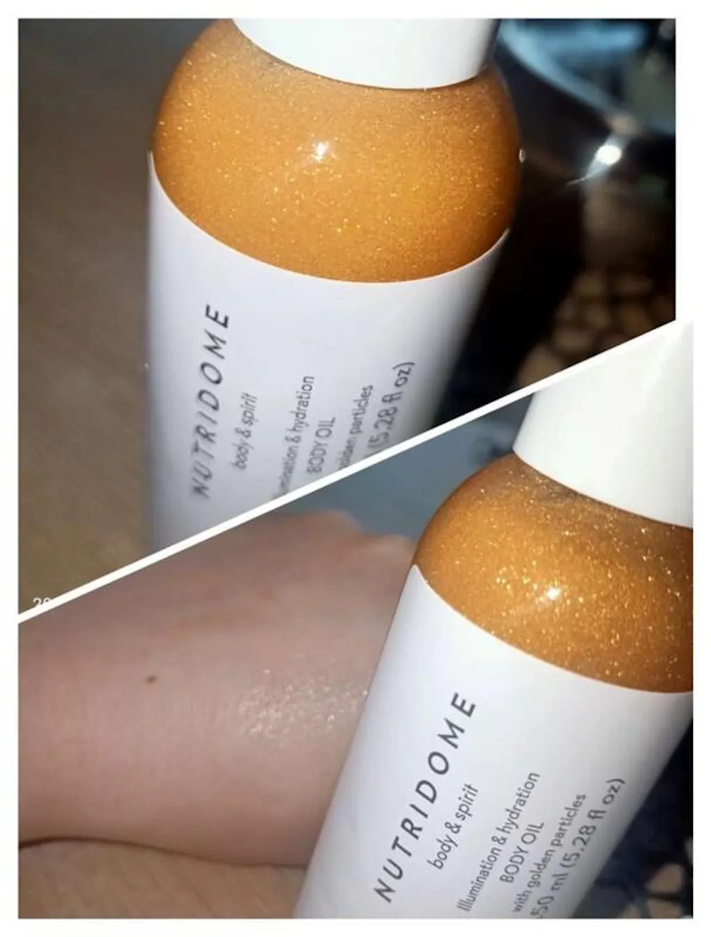 NUTRIDOME-vartaloöljyn koostumus on täynnä kultahiukkasia, jotka levittyvät helposti iholle ja antavat hienovaraisen säteilevän ilmeen. Tuote näyttää kauniilta sekä vaalealla että tummalla iholla.
